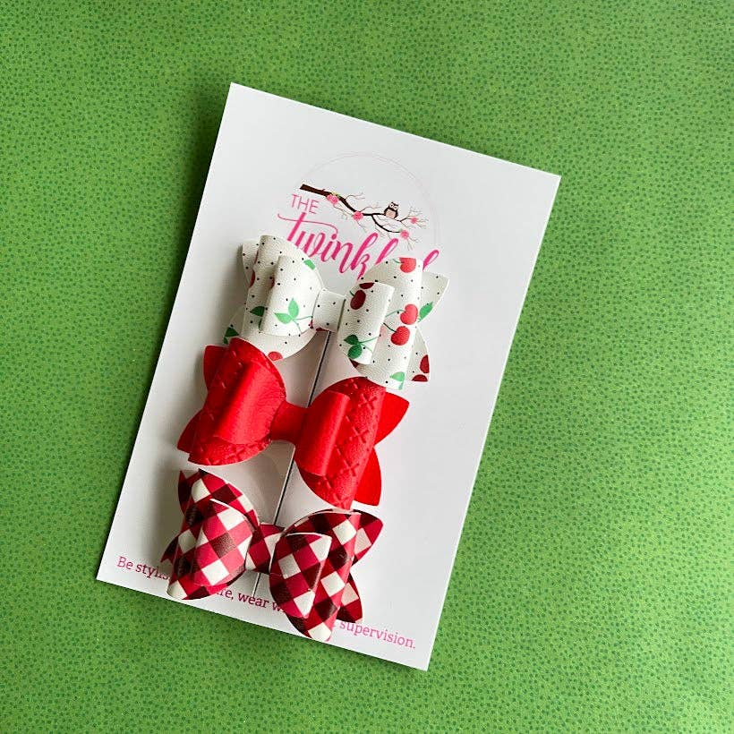 Includes a pack of three vegan leather bows using alligator clips.