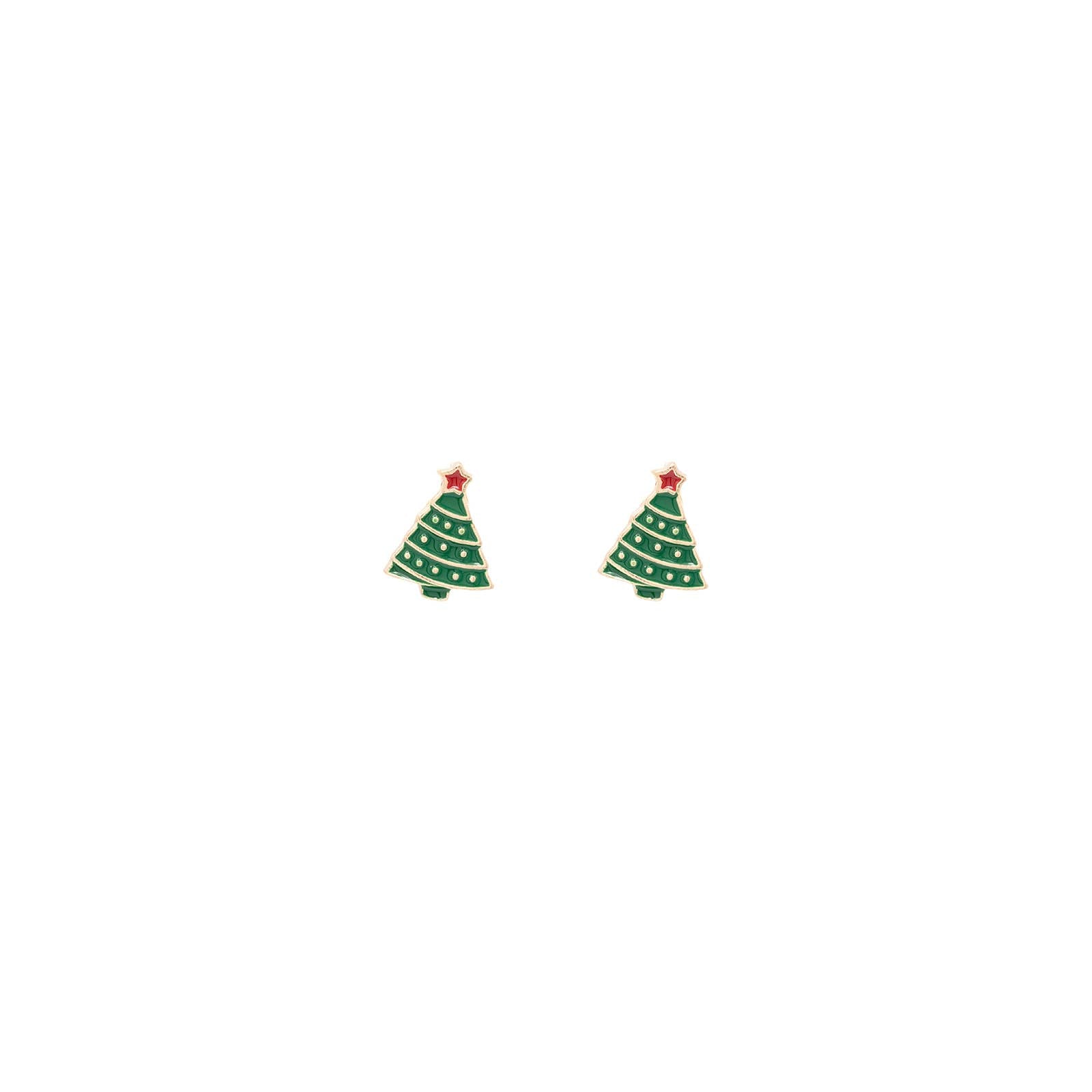 This green enamel tree with gold garland and ornaments has a red star on top. A post style earring with a metal rubber stopper.