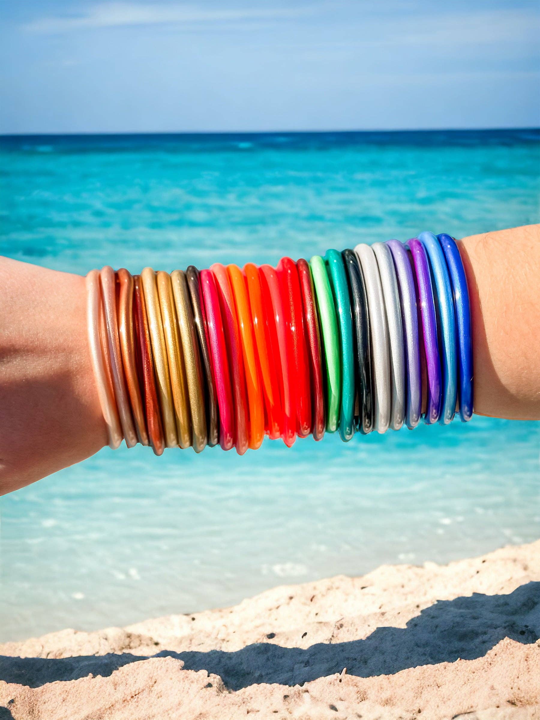Look no further than the Jinny Jelly Bangle Bracelet! This trendy jelly bracelet is the perfect addition to your summer look and is sure to bring back fond memories of childhood.