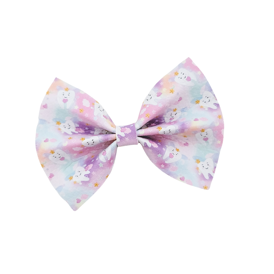 These bows are hand cut and made with vegan leather. They are approximately 3.5 inches and come on an alligator clip. Items come from a smoke and pet free home. Due to the nature of the product pattern placement may vary. Each bow comes on individual branded bow cards.