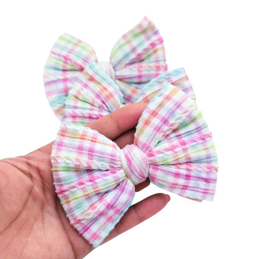 These are handmade stretch fabric bows. They are approximately 4 inches and come on an alligator clip. Items come from a smoke and pet free home. Due to the nature of the product pattern placement may vary.