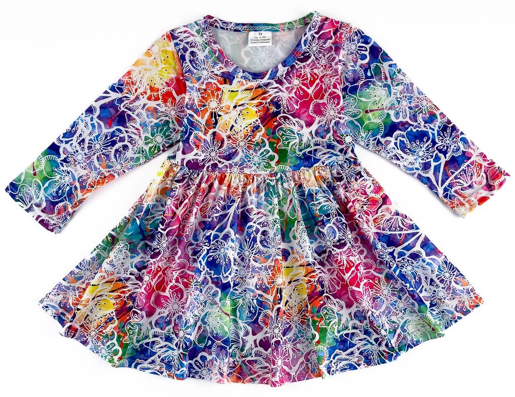 Dazzling petals in prismatic colors shine on this long-sleeved twirly dress!