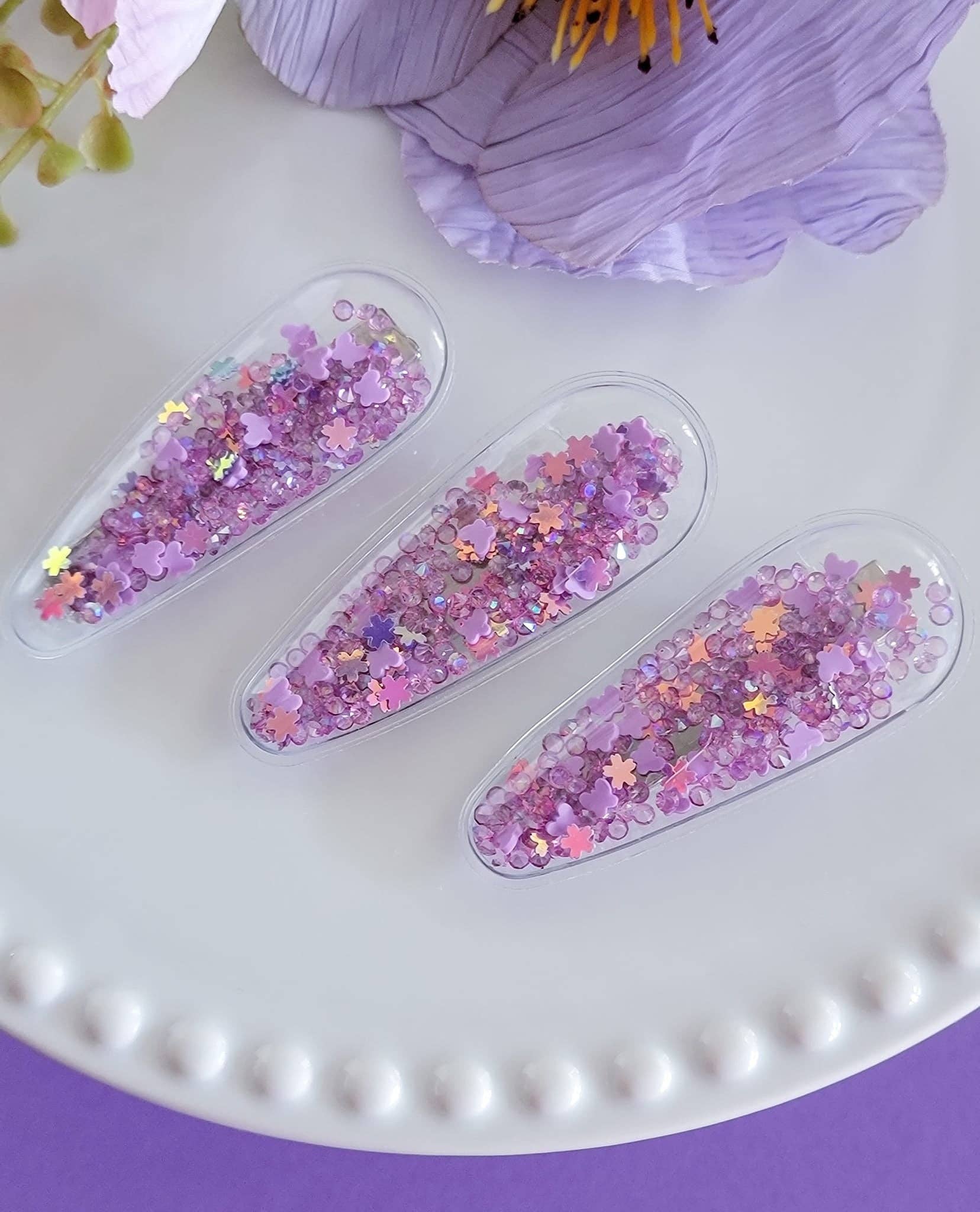 Clear with light purple butterfly clays, light purple iridescent sakura glitter pieces, and light purple iridescent gems