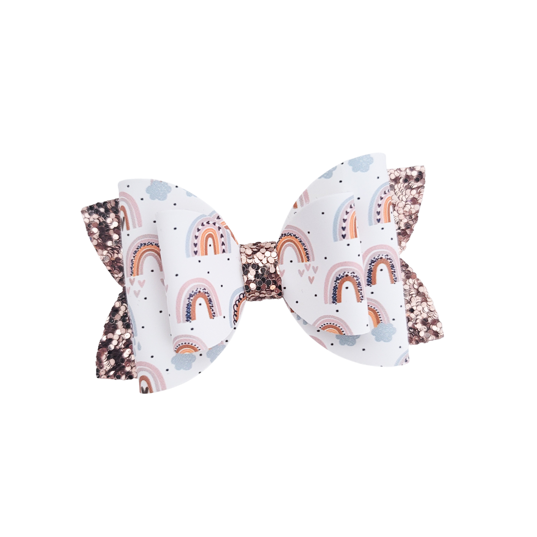 These stacked bows are hand cut and made with vegan leather and/or glitter canvas. They are approximately 3.5 inches ans come on an alligator clip with teeth. Items come from a smoke and pet free home. Due to the nature of the product pattern placement may vary.