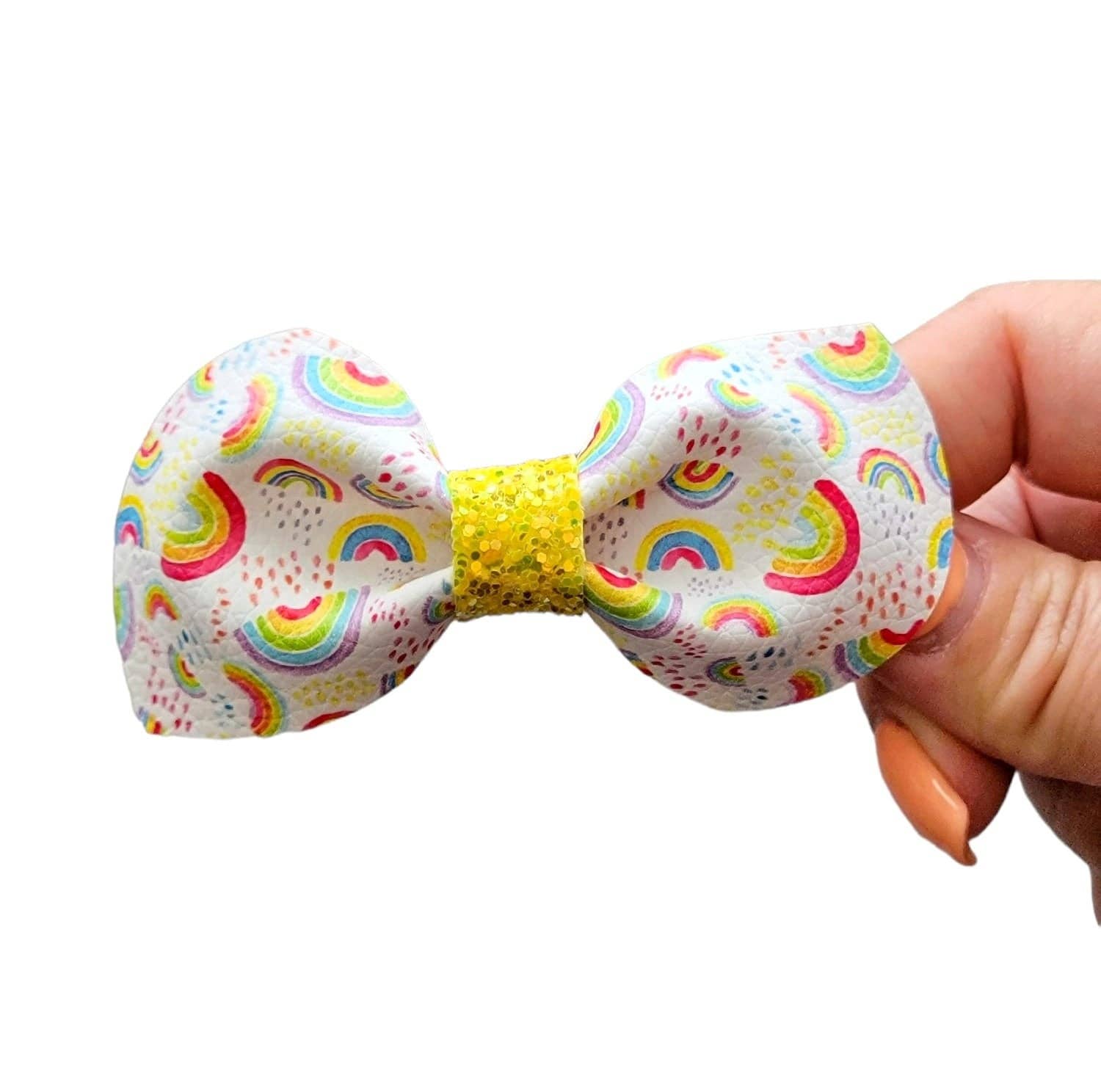 Bright Rainbows on faux leather with a yellow chunky glitter center