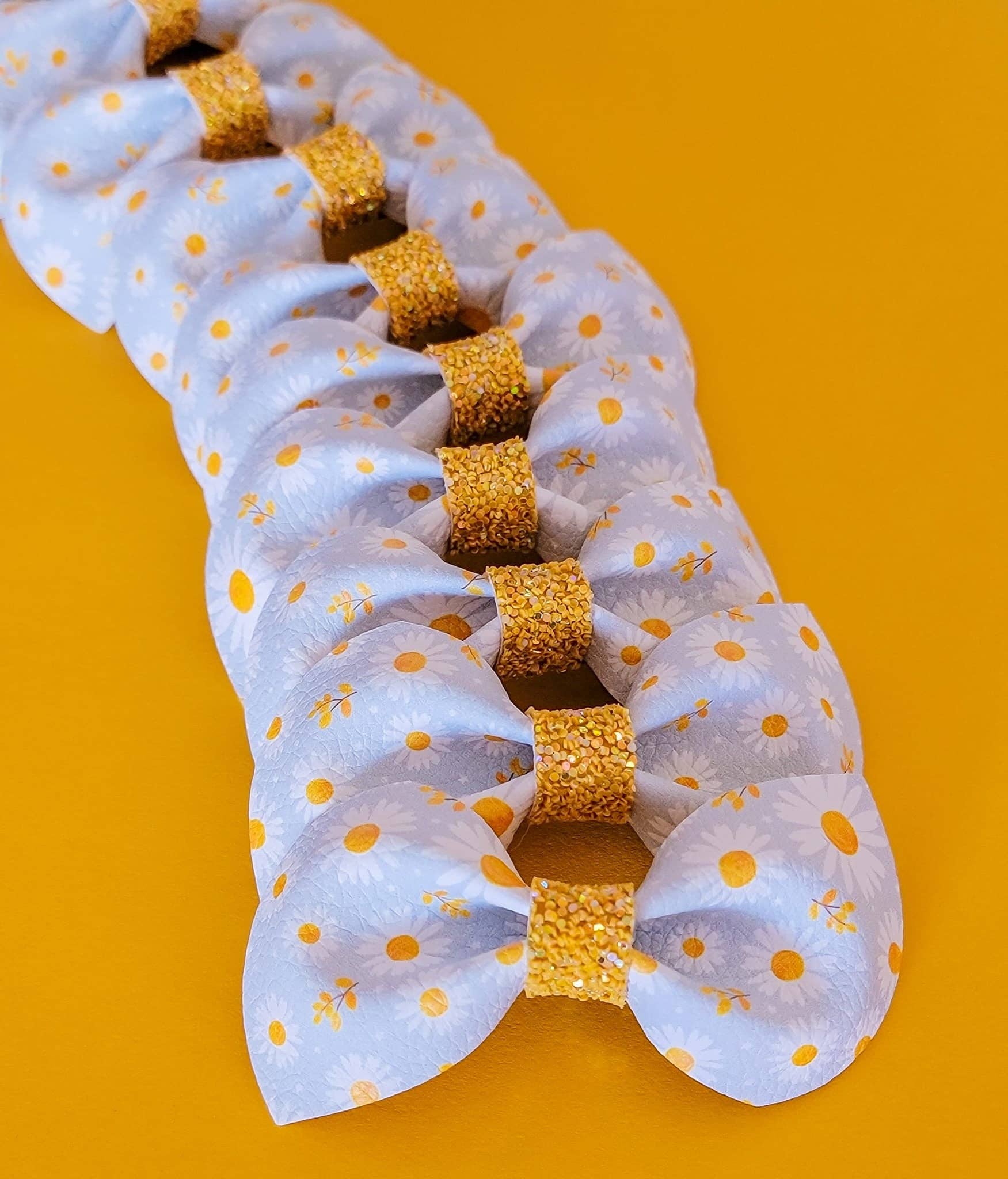 This Sadie bow is: Approximately 3.5 inches from side to side Attached to a 2.25 inch right-sided alligator clip with teeth Daisies on faux leather **Please note that some colors may appear slightly different based on your monitor settings**