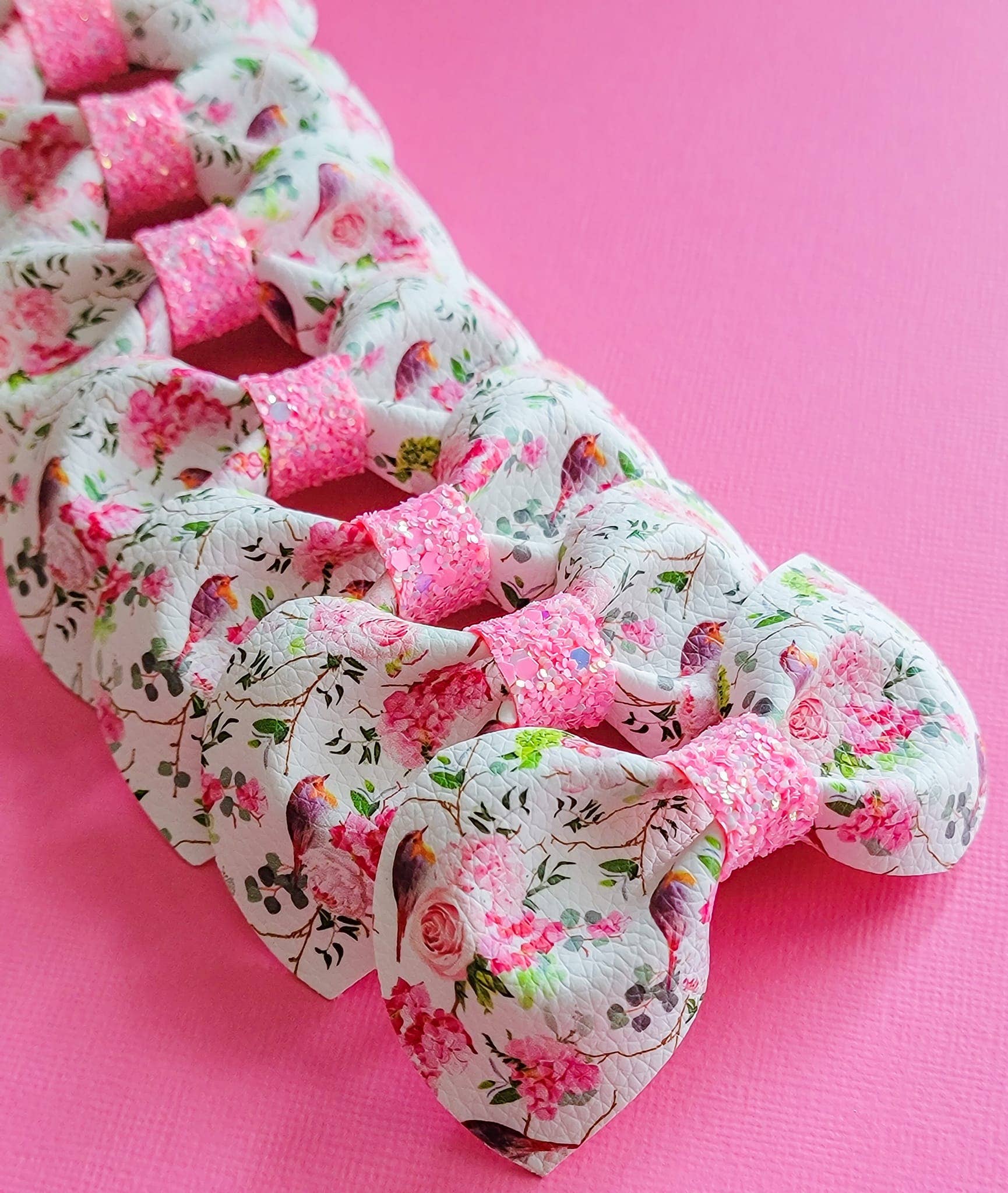 This Sadie bow is: Approximately 3.5 inches from side to side. Attached to a 2.25 inch right-sided alligator clip with teeth. Secret Garden faux leather.