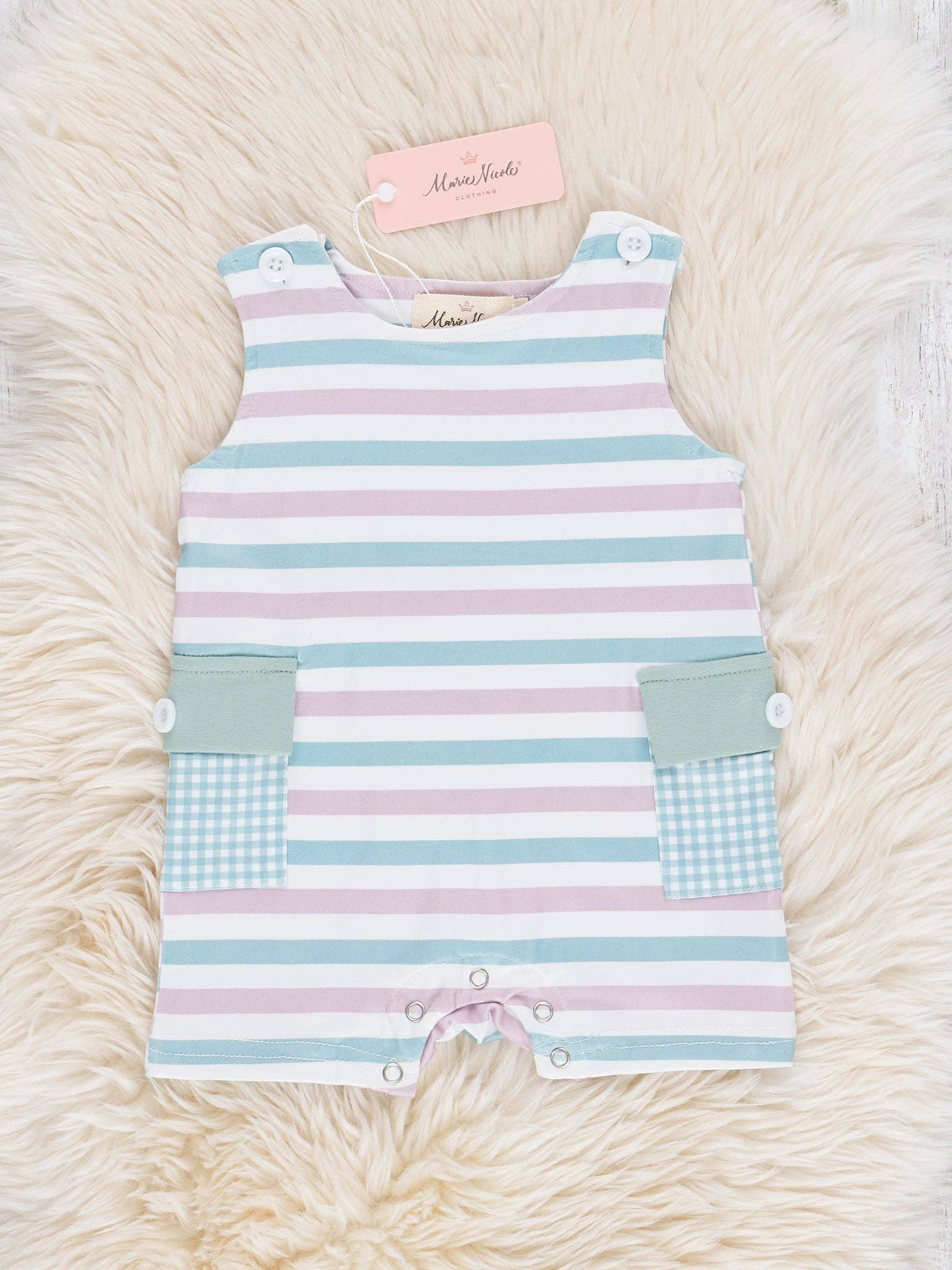 Dress your little man in this playful Sage Stripes Pocket Johnny from Marie Nicole Clothing. The boys romper features a striped bodice with a charming pocket and button details, perfect for summer days. Grab the brother set for a sweet and coordinated look! * Snap buttons. * Fits true to size. * 95% Polyester / 5% Spandex * Combo: 97% Cotton / 3% Spandex *
