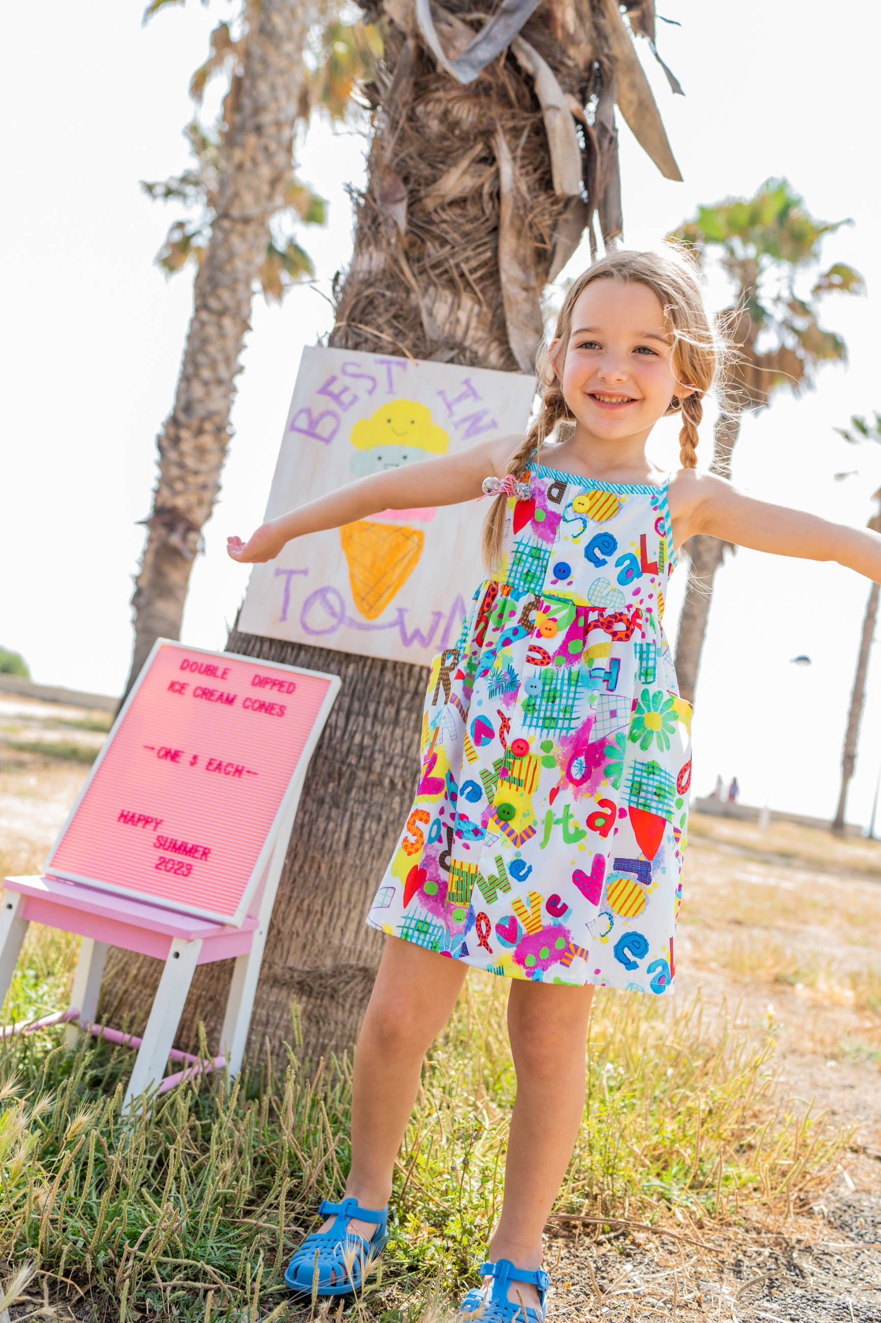 White tank dress with colorful print and white and blue striped trim on the straps.