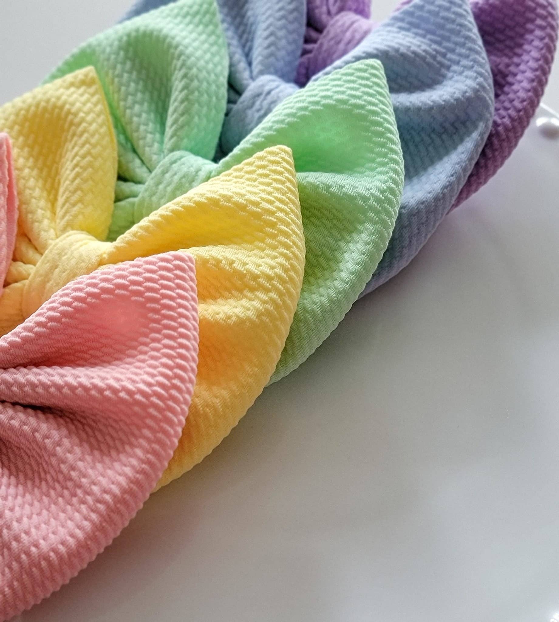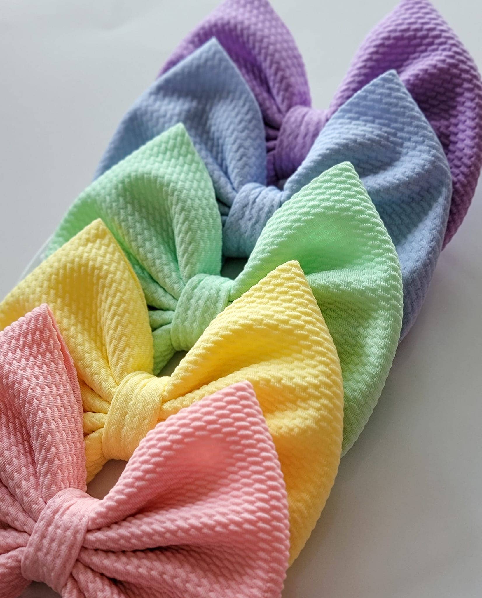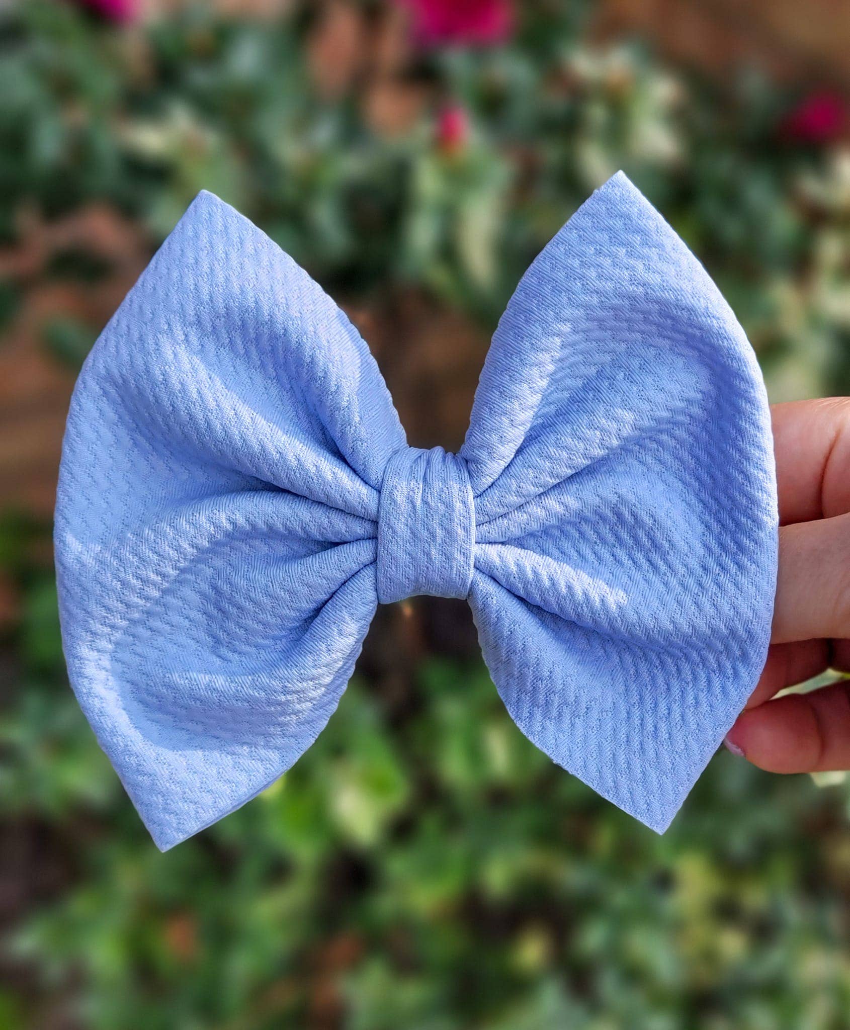 This Savannah bow is: Approximately 5.5 inches from side to side Attached to a 3 inch right-sided alligator clip with teeth (Nylon headband available upon request) Dusty Blue Pastel bullet/Liverpool fabric **Please note that some colors may appear slightly different based on your monitor settings**