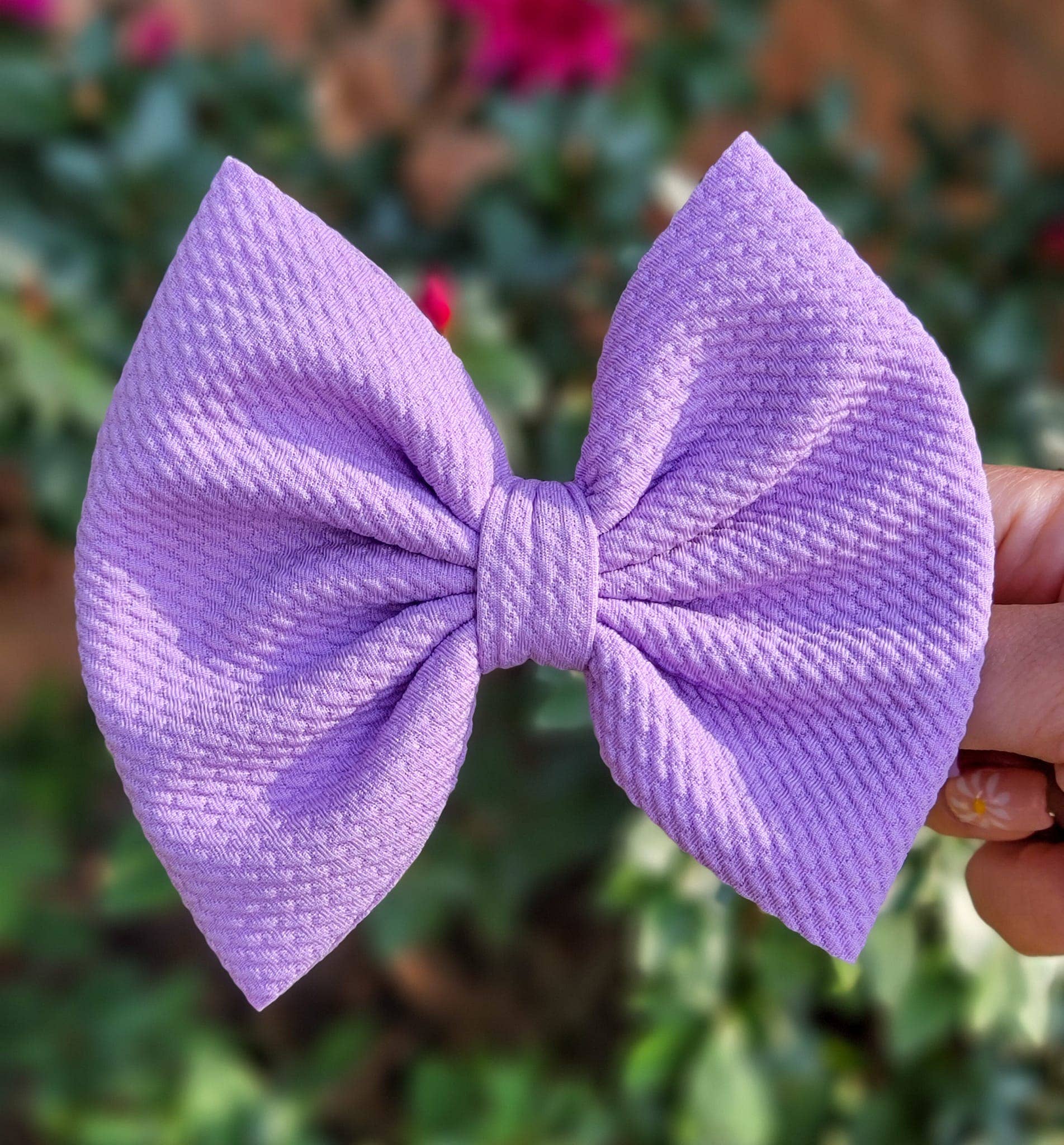 This Savannah bow is: Approximately 5.5 inches from side to side Attached to a 3 inch right-sided alligator clip with teeth (Nylon headband available upon request) Lavender Pastel bullet/Liverpool fabric **Please note that some colors may appear slightly different based on your monitor settings**