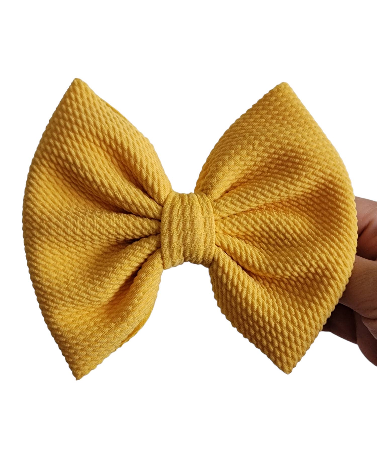This Savannah bow is approximately 5.5 inches from side to side, attached to a 3 inch right-sided alligator clip with teeth. Yellow Mustard bullet/Liverpool fabric.