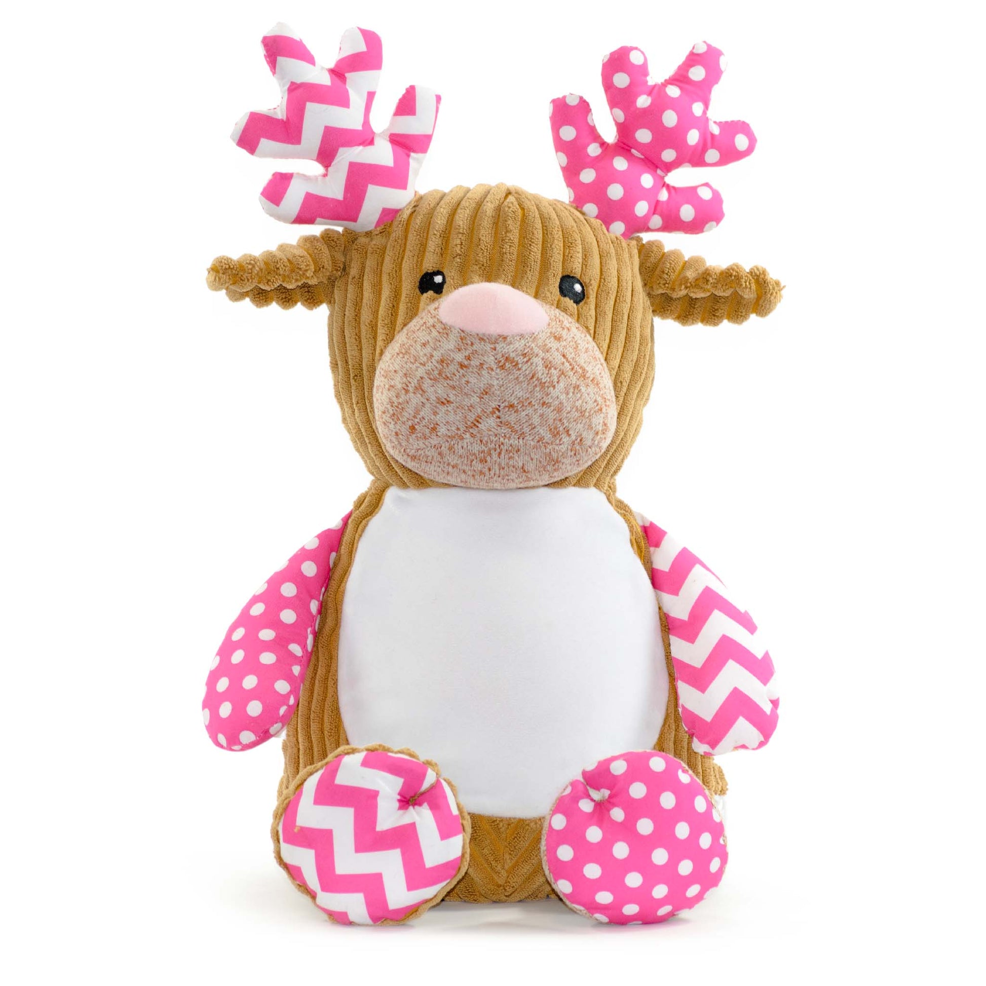 Cupcake has a corduroy brown body, decorated, patterned antlers, arms and feet and black eyes.