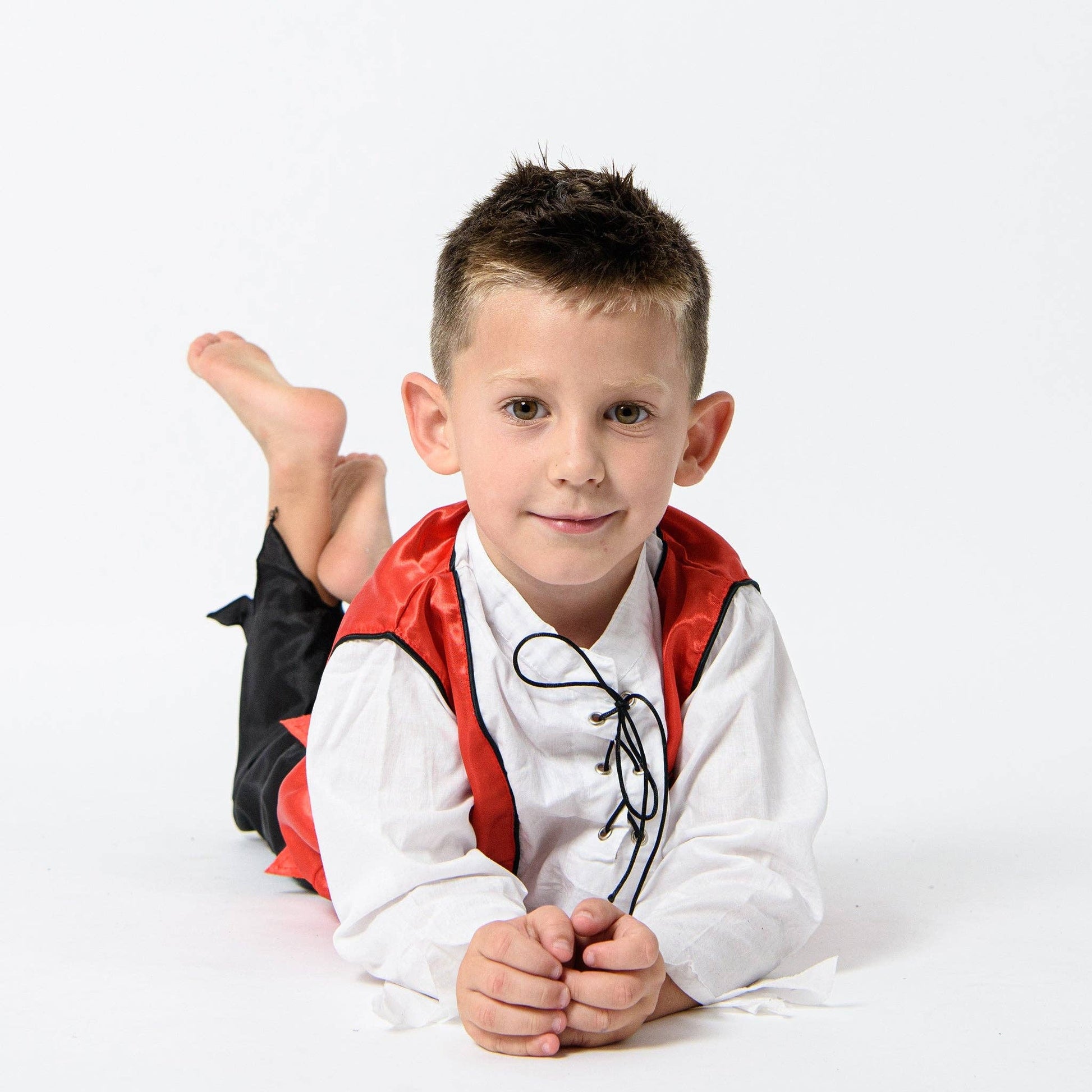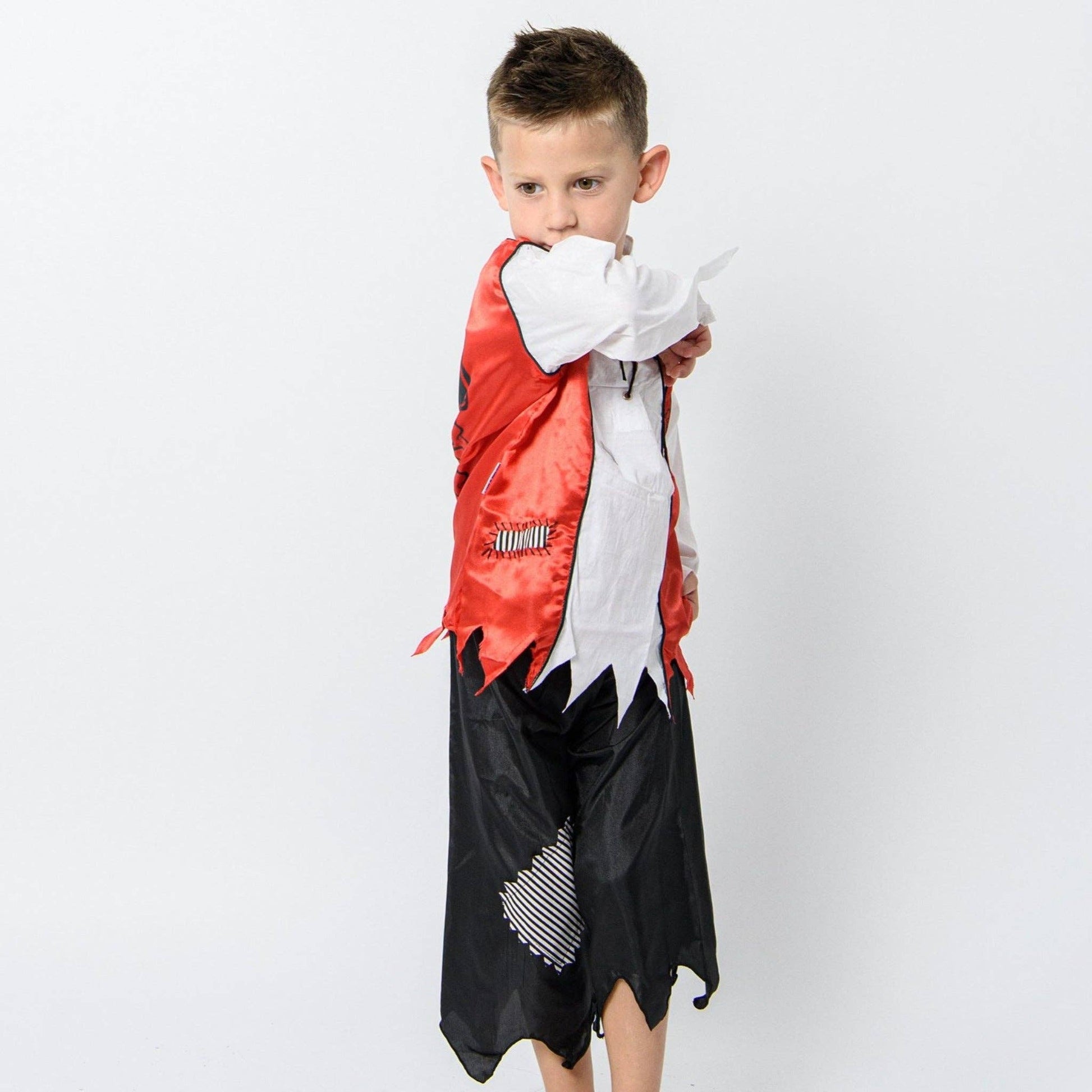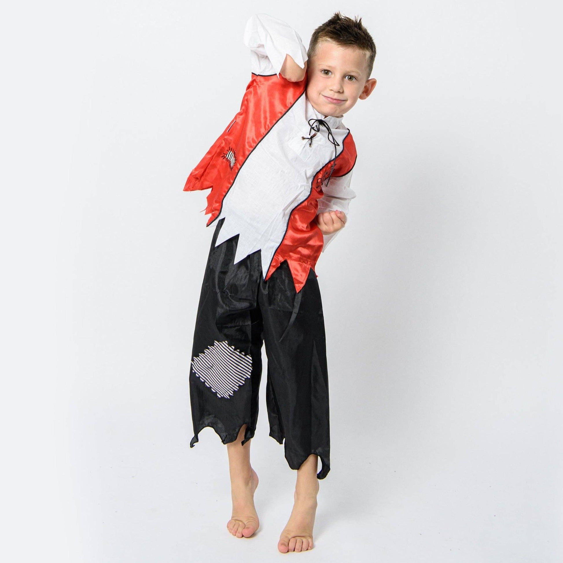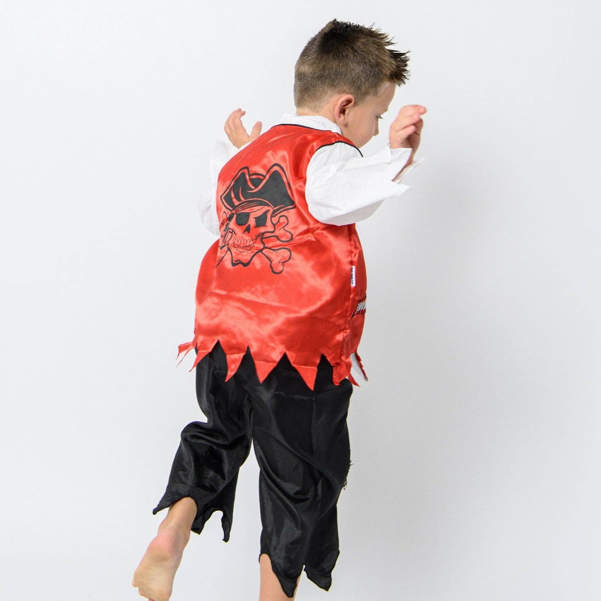 Designed in Australia; handmade in Indonesia. A Very authentic pirate outfit with a jolly roger printed on the back. This set of 2 includes Black Pants with a patch and a shirt with a vest attached to it. is made using soft cotton and satin so it breathes well and is very comfortable. The shirt features a lace up bodice with black string giving a distinct pirate look. Jack Sparrow perhaps. Perfect for parties, Book Week or playtime at home.