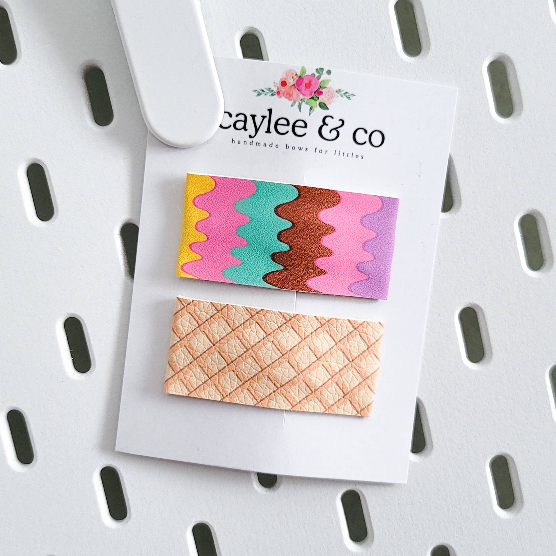 These clips are hand cut and made with vegan leather or glitter. They are approximately 2 inches. They come as a set as pictured. Due to the nature of the product pattern placement may vary.