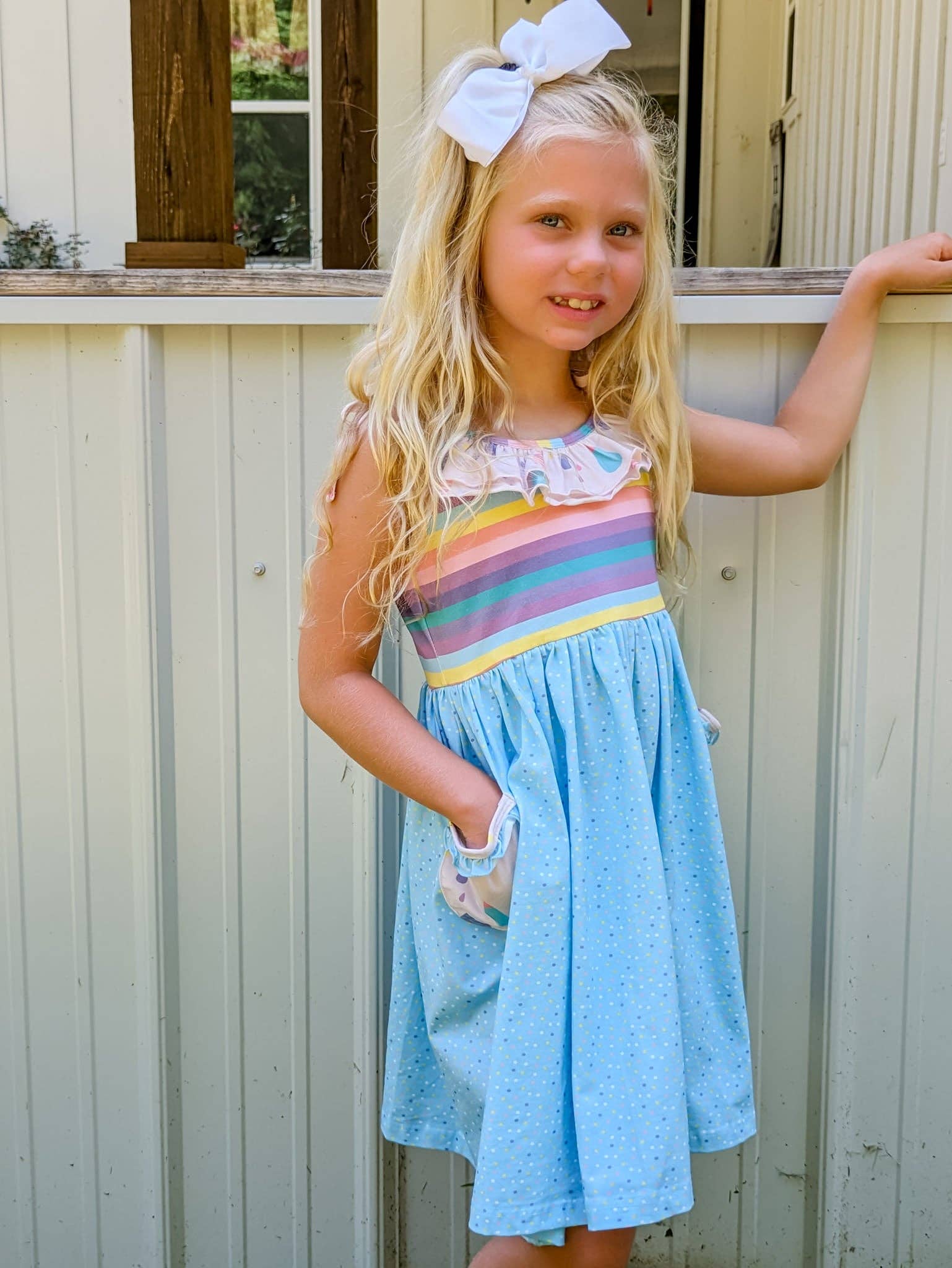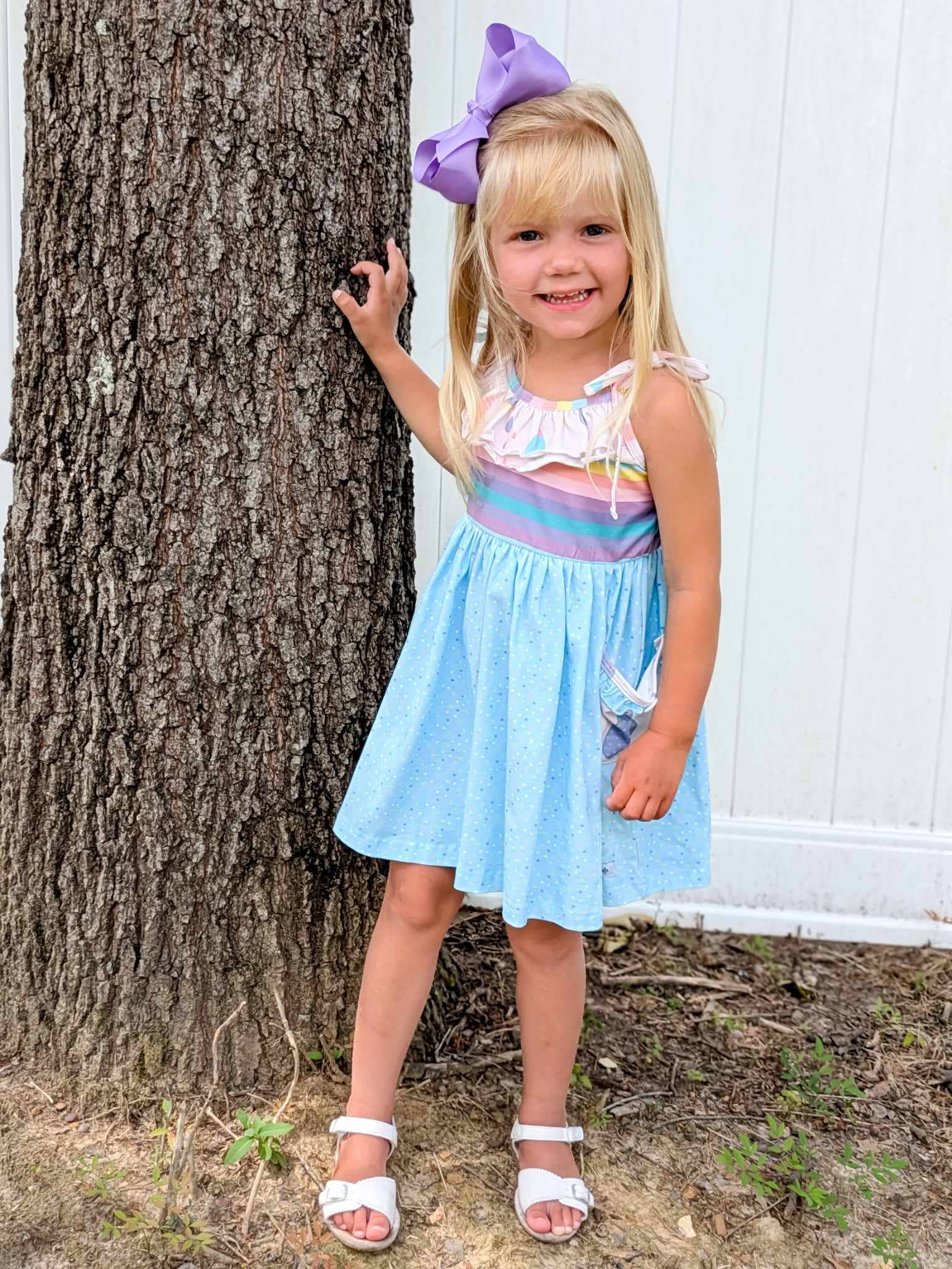 This all knit dress makes summer styling a breeze! Katie features ties at the shoulder to help customize fit and a little added length for comfort and coverage. She still twirls like a dream though, so don't forget the shorties!