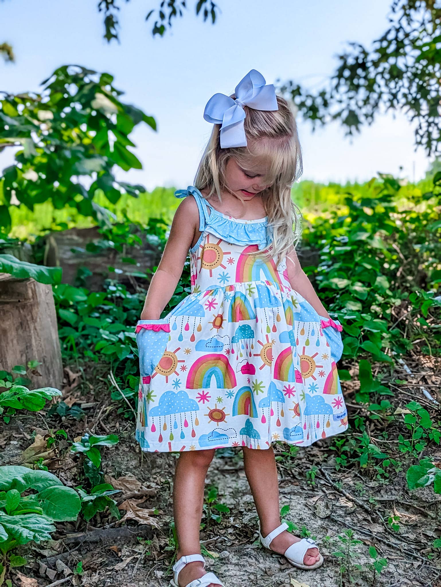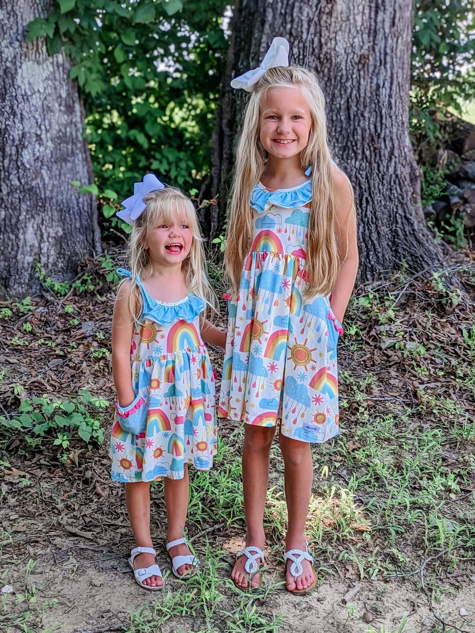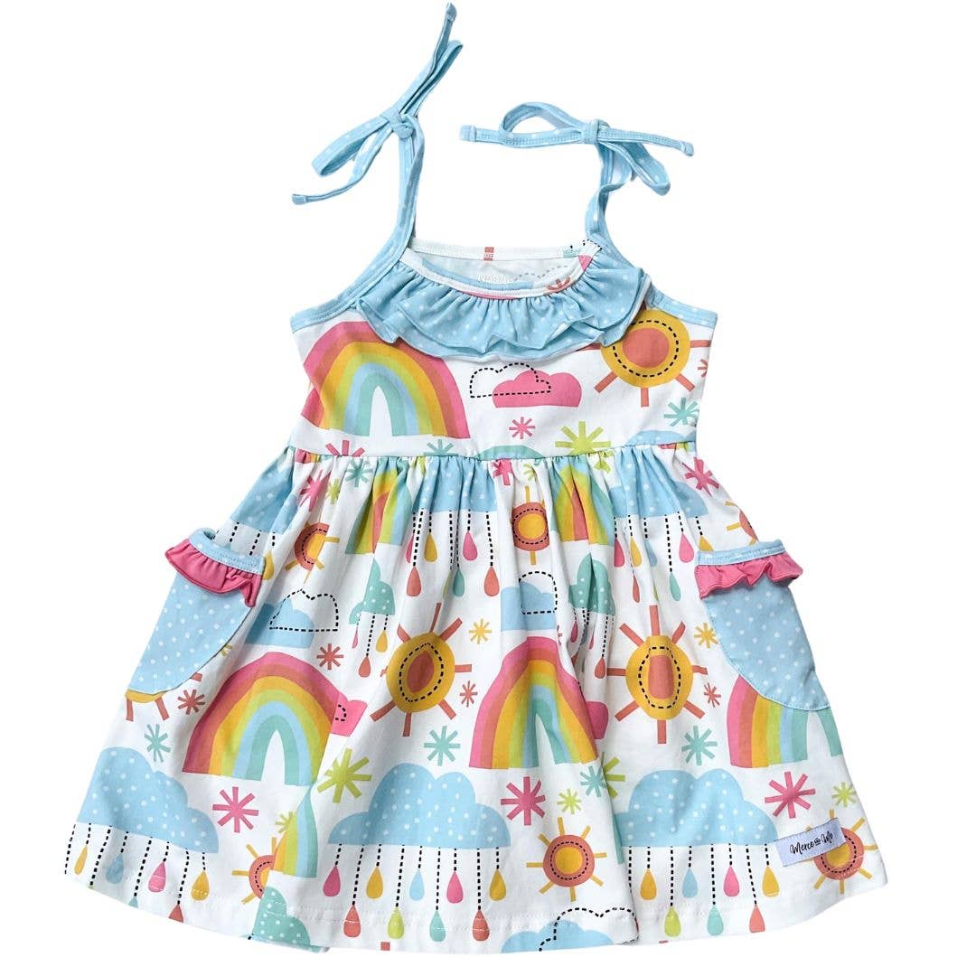 Bring some sunshine and rainbows into your wardrobe with the Katie Dress! Featuring adorable tie shoulders and playful ruffle accented pockets, this dress is perfect for adding a touch of whimsy to her wardrobe. Don't let cloudy days bring you down, stay bright and cheerful with this fun and quirky dress!